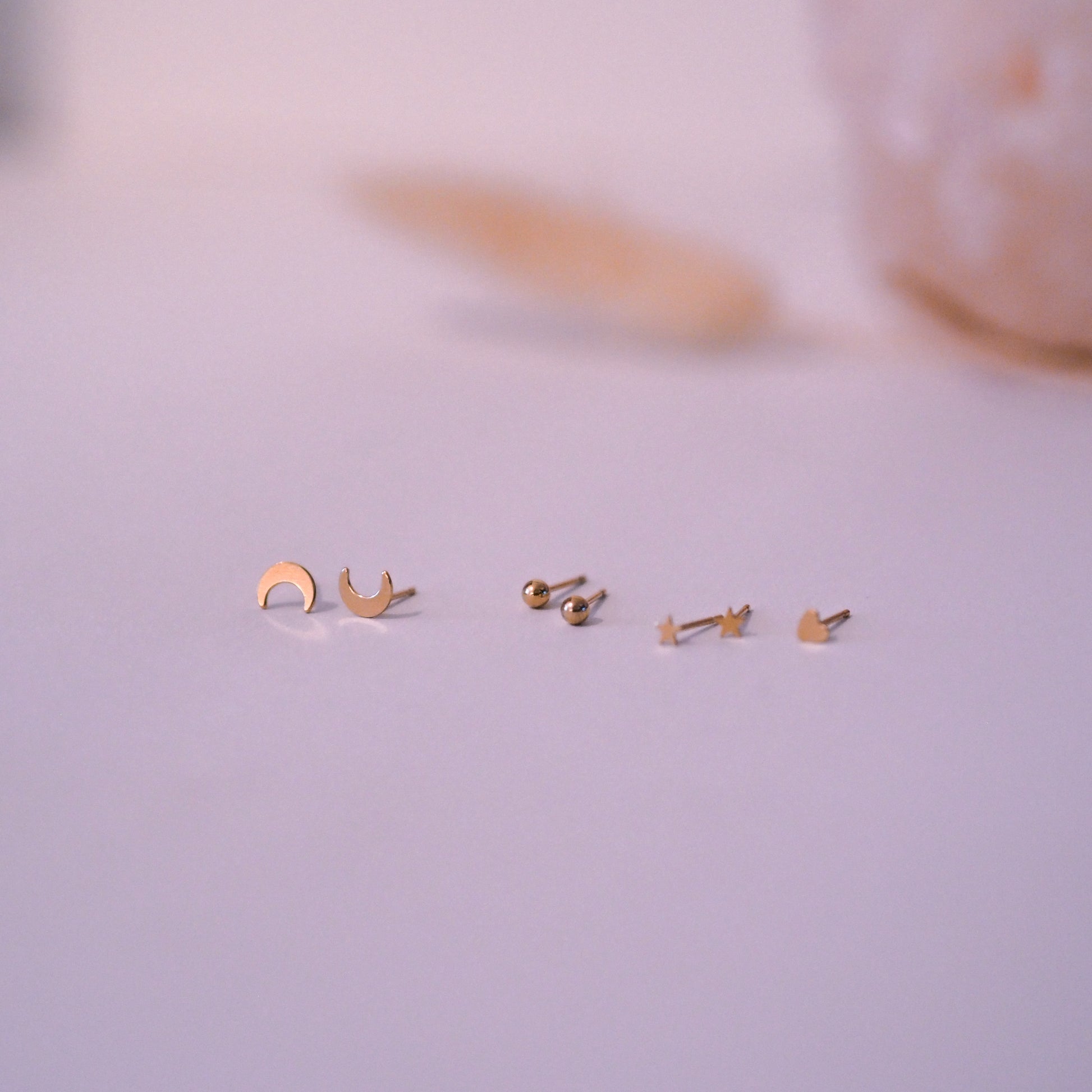 Zarte, kleine Mini Ohrstecker aus 14k Goldfilled (= Goldgefüllt) - Sonne, Mond, Sterne und Herz - für einen modernen, verspielten Look. Perfekt zum Kombinieren, Layering oder einfach um deinem Alltag einen kleinen, funkelnden Akzent zu verleihen.